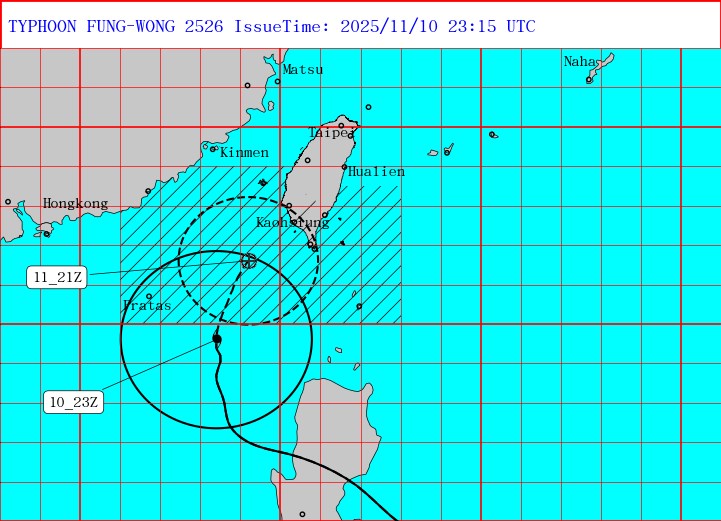 Taipei, 11 Nov. (CNA) Direktorat Jenderal Cuaca Pusat (CWA) pada pukul 5.30 pagi Selasa (11/11) mengeluarkan peringatan darat untuk Taifun Fung-Wong, yang pusat badainya diperkirakan akan memasuki daratan Taiwan hari Rabu.