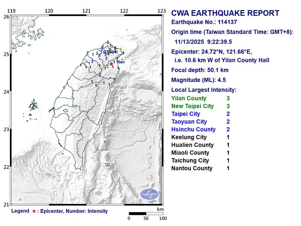 Taipei, 13 Nov. (CNA) Gempa 4,5 SR mengguncang Desa Yuanshan, Kabupaten Yilan pada pukul 9.22 pagi hari Kamis (13/11), menurut Direktorat Jenderal Cuaca Pusat (CWA).