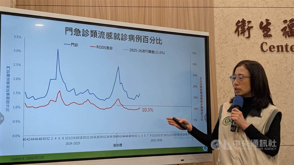 Lee Chia-lin (李佳琳), wakil direktur Pusat Intelijen Epidemi CDC, mengatakan kunjungan meningkat 11,9 persen dari minggu sebelumnya, dan dari 13-19 Januari, 17 kasus baru komplikasi influenza berat dan dua kematian terkait telah dilaporkan.