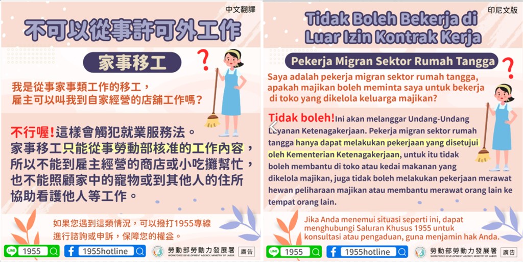 Taipei, 13 Feb. (CNA) Menjelang Tahun Baru Imlek, pekerja migran asing di Taiwan diingatkan untuk tidak melakukan pekerjaan di luar ruang lingkup kontrak kerja, termasuk kegiatan bersih-bersih rumah secara menyeluruh, karena praktik tersebut berpotensi melanggar ketentuan hukum ketenagakerjaan dan dapat berujung pada sanksi administratif.